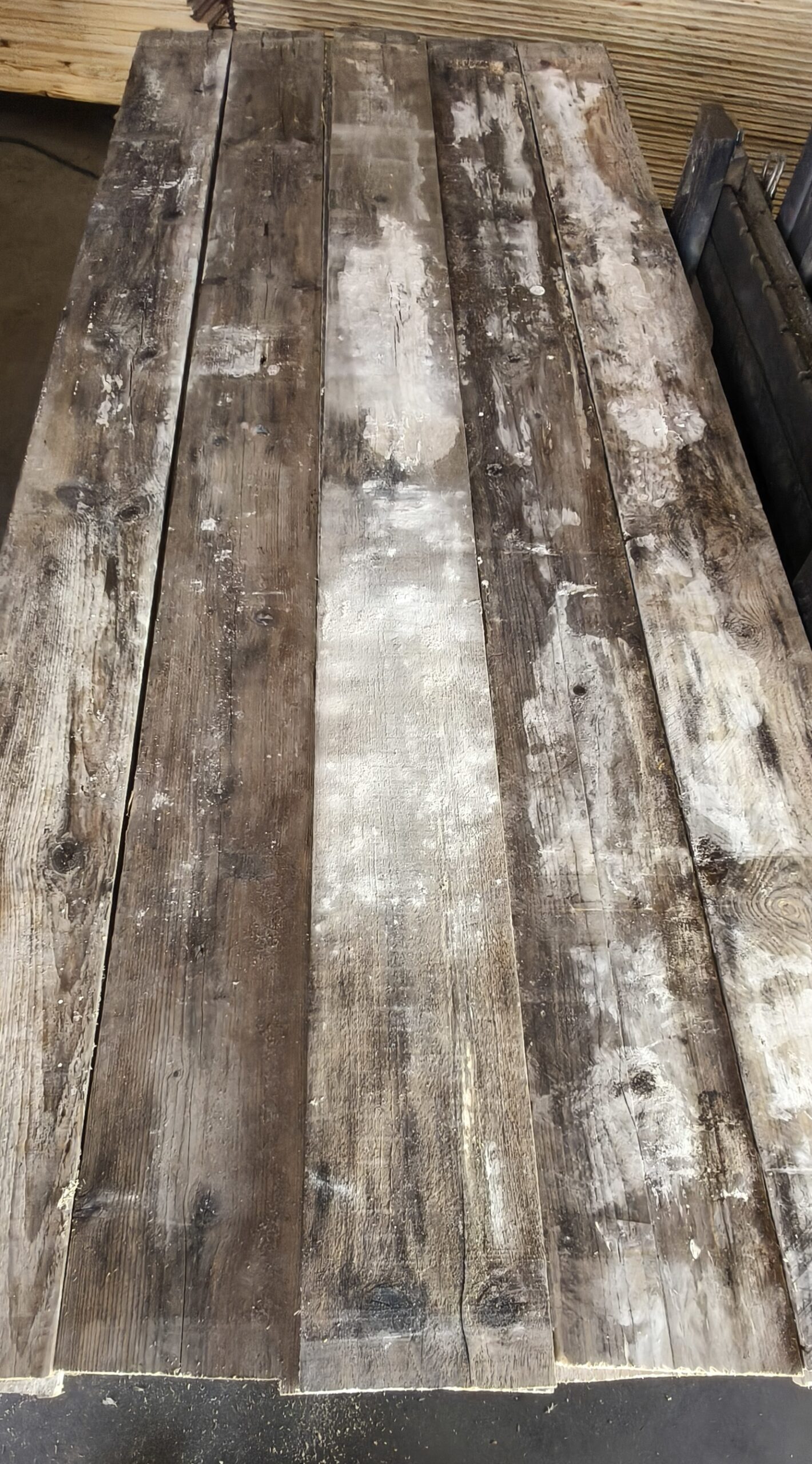 Deze planken zijn uit 30mm dikke steigerplanken gezaagd (in dikte), en hebben daardoor een blanke gezaagde achterzijde en een dikte van maar ±13mm