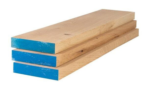 Deze eiken planken worden geproduceerd in midden Europa. Er worden eiken planken gezaagd, die vervolgens gedroogd worden. Deze eiken planken worden aansluitend op dikte en breedte geschaafd tot de planken die u hierboven ziet. De kopse kanten worden behandeld om scheurvorming tegen te gaan. Dit blauwe stukje kunt u er makkelijk afzagen.