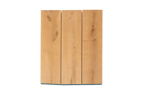 Deze eiken planken worden geproduceerd in midden Europa. Er worden eiken planken gezaagd, die vervolgens gedroogd worden. Deze eiken planken worden aansluitend op dikte en breedte geschaafd tot de planken die u hierboven ziet. De kopse kanten worden behandeld om scheurvorming tegen te gaan. Dit blauwe stukje kunt u er makkelijk afzagen.